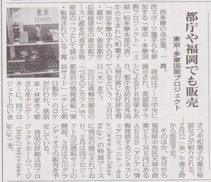 西多摩新聞に「都庁や福岡でも販売」というタイトルの記事が掲載されました。どうもありがとうございます。